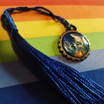 Both charms come with a dark blue tassle attached and have iridescent effects in the light. The larger pendant is oval shaped, while the smaller one is round.